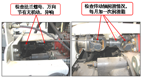 3、传动轴:检查法兰螺母有无松脱;检查万向节有无松动、异常拌动、噪音